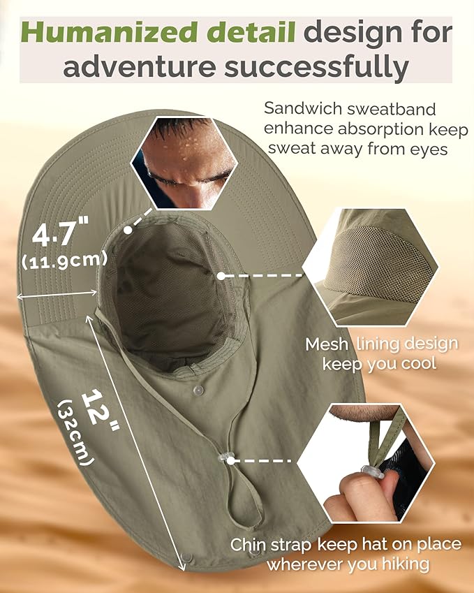- UPF 50+ Sun Protection: The fishing sun hat blocks 99% of UV Rays.4.7 inch wide brim and extra back coverage,covering and protecting your face,ear and neck much better.Windproof and breathable,perfect for summer outdoor activities hiking