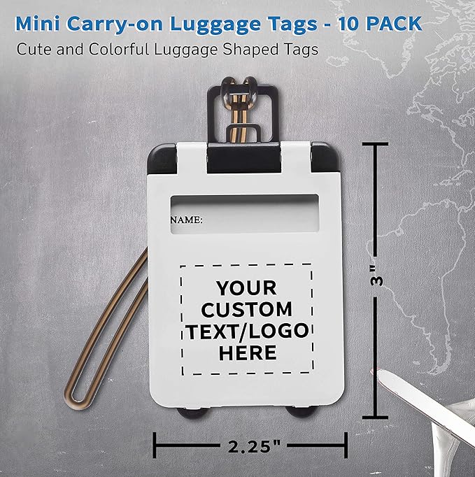 10 Mini Carry-on Luggage Tags Pack - Customizable Text, Logo - Flip Open Cover, ID Sticker - White