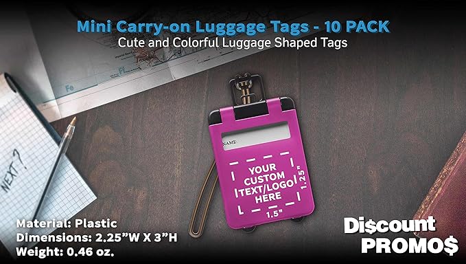 10 Mini Carry-on Luggage Tags Pack - Customizable Text, Logo - Flip Open Cover, ID Sticker - Purple