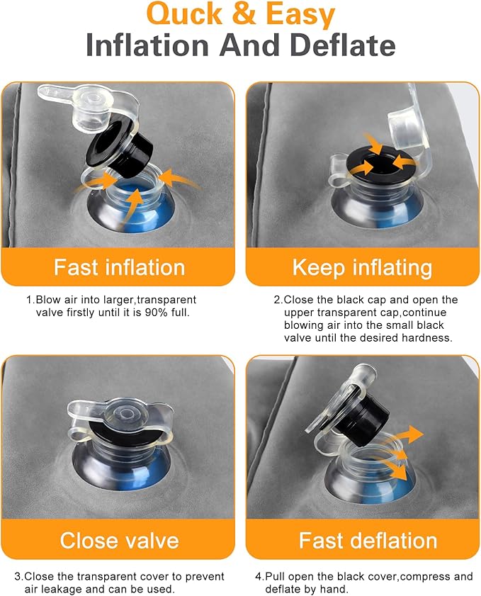 - Very User-Friendly Design: Our inflatable foot rest pillow with 2-in-1 double valve,the upper black air valve is a one-way air inlet for inflating or replenishing gas.bottom transparent air valve can be quickly inflated and deflated,when you are done blowing it up, push clear cover on and push whole valve in so that it is flush with the side of the travel foot pillow,the airplane footrest takes away the hassle of bringing a pump and making noise in flight.