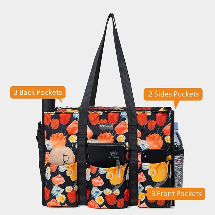 TOPDesign Utility Water Resistant Tote Bag with 13 Pockets, Top Zipper Closure & Thick Bottom Support, for Working Women