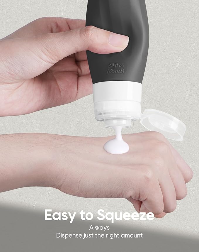 - SAFE SILICONE MATERIAL: Made of Food Grade BPA Free Silicone, this travel set is sturdy, soft, squeezable, flexible and reusable. Safe material guarantee that you can not only use them to store travel essentials like shampoo, conditioner, face soap, sunscreen, creams, lotion or etc, but also safe for food, various seasonings. Soft silicone body make you squeeze out contents easily