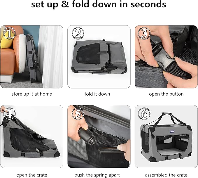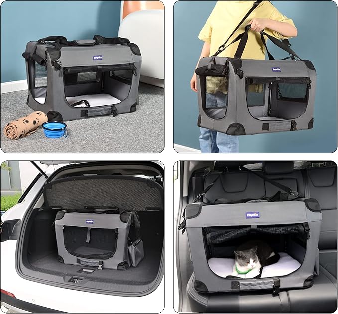 - 【360°Ventilation & Multi-Door Access】Four-sided mesh panels ensure excellent airflow and a clear view for your pet, while three secure doors allow freedom to enter and exit. Ideal for road trips or vet visits—especially in SUVs or midsize vehicles. Please note: this soft portable dog crate is not designed for compact cars or airline travel.
