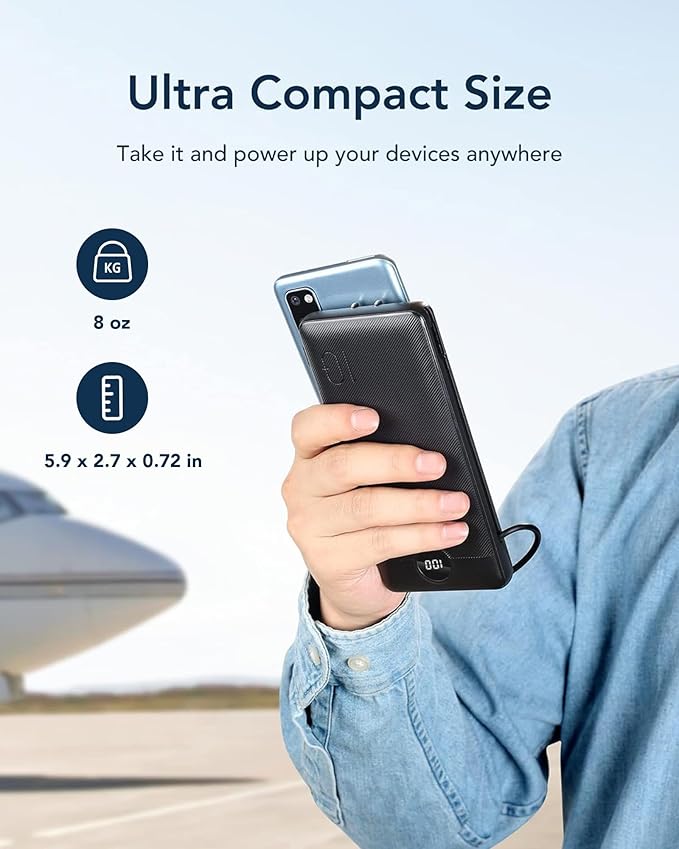 - 【10000mAh Capacity with Slim Body】: With a slim size of 5.9 x 2.7 x 0.72 inch size, 8oz weight, the external battery is a perfect travel accessory. Full 10000mAh Capacity is enough for daily used, which provides charges 1.8 for iPhone15/14, 1.6 charges for Samsung S23.