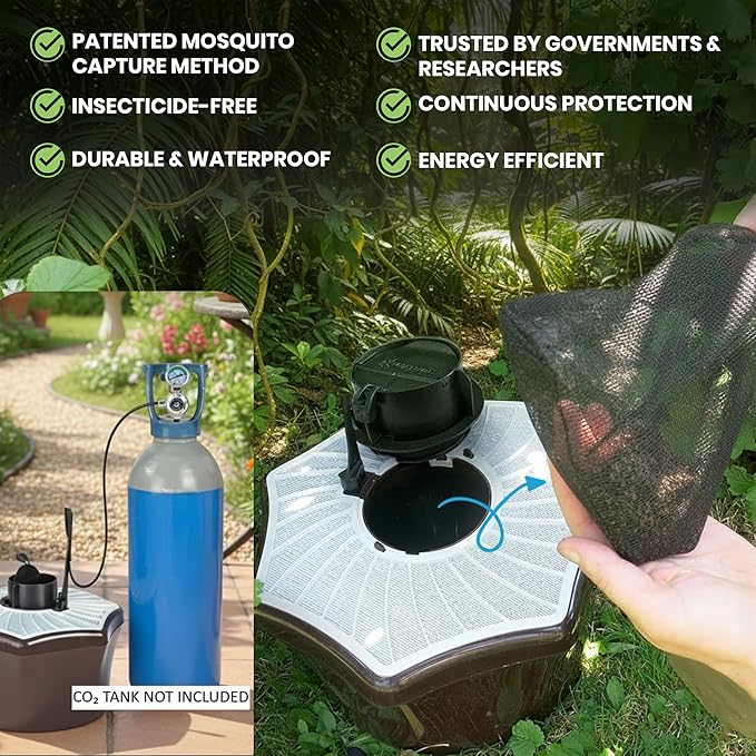 - Safe, Eco-Friendly Control – No pesticides. No zapping. Just continuous, family- and pet-safe protection using airflow, scent mimicry, and CO₂ to attract and trap a wide range of mosquitoes, not pollinators.