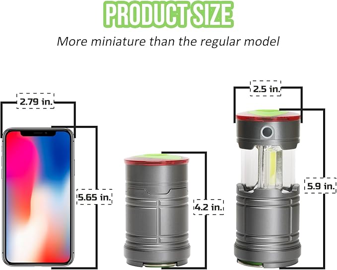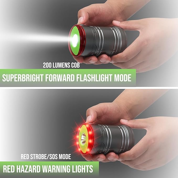 - ULTRA BRIGHT & WIDE AREA: Super bright 200 lumens COB LED for 360° lighting (97 sq.ft coverage); 4 Light modes: 200 Lumens collapsible COB LED lantern, 150 lumens flashlight, red warning light (strobe and SOS); battery not included (3 x AAA needed)