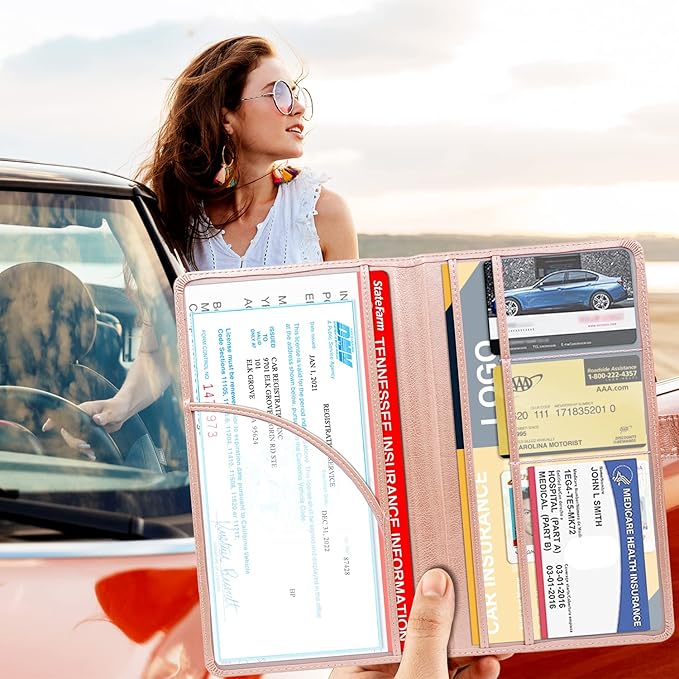 - WELL ORGANIZED: The car document holder has been custom made to perfectly keep all of your important documents together. It has multi-function clear compartments which can organize various items very well. Clear and easy to read both documents when you open it up. 1 large pocket for insurance documents and 2 pockets for vehicle registration, 3 small pockets for driver's license, ID cards, AAA cards, business cards, receipt, key contact information cards, etc.