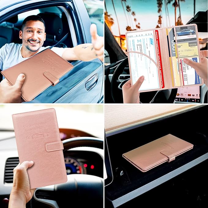 RSAquar Car Registration and Insurance Holder, Leather Car Glove Box Organizer, Cool Car Accessories for ID, Driver's License Cards & Essential Document, Men&Women, Rose Gold