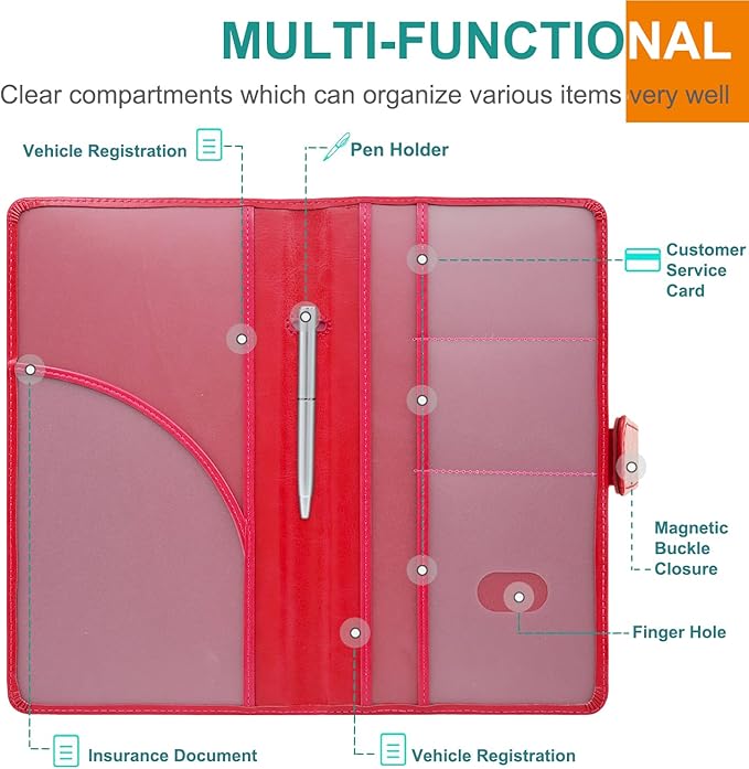 - WELL ORGANIZED: The car document holder has been custom made to perfectly keep all of your important documents together. It has multi-function clear compartments which can organize various items very well. Clear and easy to read both documents when you open it up. 1 large pocket for insurance documents and 2 pockets for vehicle registration, 3 small pockets for driver's license, ID cards, AAA cards, business cards, receipt, key contact information cards, etc.