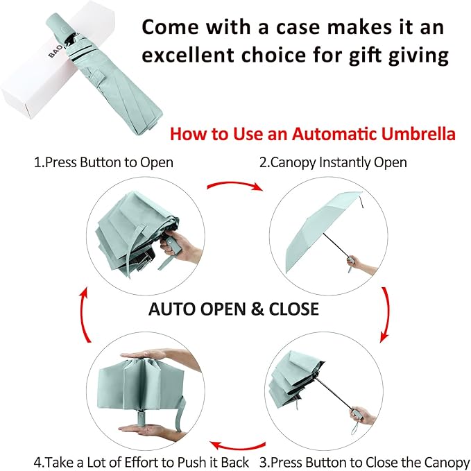 - Automatic Open and Close Umbrella: Easy to open and close, with push button auto-open and auto-close feature. This folding umbrella where you press a button and it automatically open, then close when you press it again