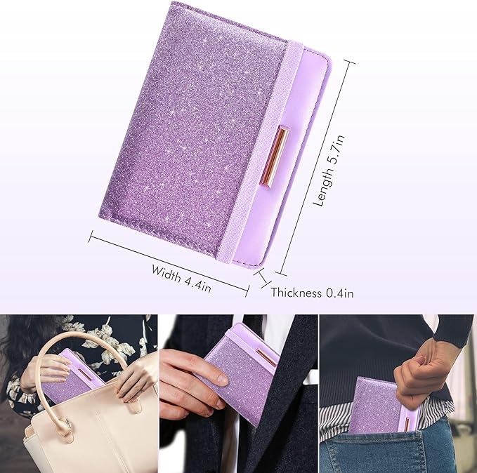 Caweet Passport Holder and Vaccine Card Holder Combo RFID Blocking Leather Vaccination Card Wallet with Elastic Band Closure, Glitter Purple
