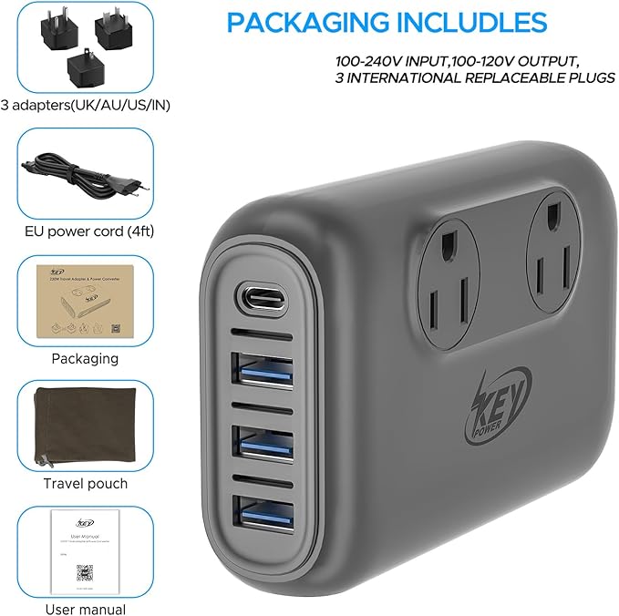 220V to 110V Converter, Key Power 230-Watt Step Down Voltage Converter & Power Converter, International Travel Power Adapter with USB C Port 18W.