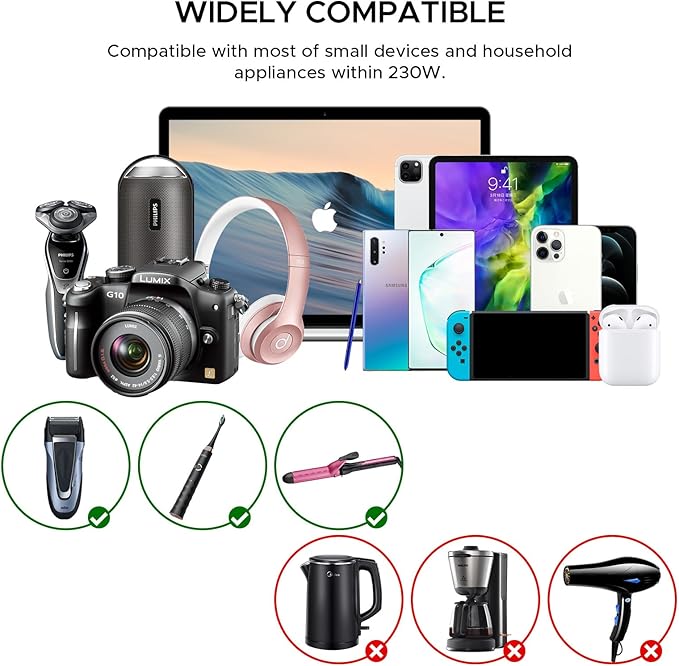 - SAFETY and PROTECTIONS: Over-current, over temperature, short-circuit and overload. [Note: USB outputs are completely isolated from the AC power to keep your devices safe] {Friendly reminder: Do Not Use with Hair Dryers, Tools and other Household Appliances over 230 watts. Included adapters are NOT compatible in South Africa and Italy (Please buy these adapters separately)}