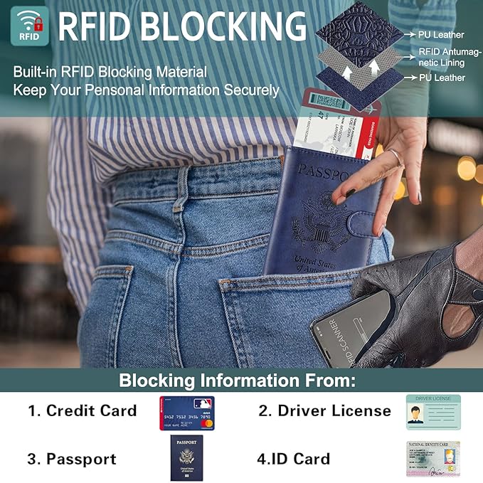 - RFID Blocking - The passport holder is equipped with advanced RFID blocking technology, offering protection against RFID skimming. With our RFID passport wallet, no more worry about leakage of your valuable personal information is stored in your passport and credit cards.
