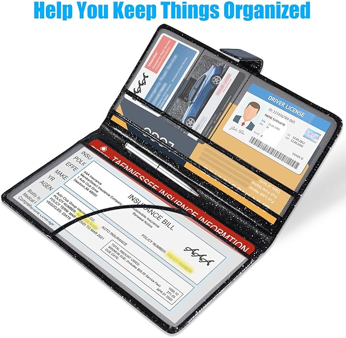 - ORGANIZE IMPORTANT DOCUMENTS: This car document holder is a great way to keep all of your important documents together. Glove box organizer ensures that you will always be able to find the necessary information when needed. Our car registration holder has 1 large pocket for your important documents like your car insurance, 2 pockets to hold vehicle registrations cards, 3 small pockets that can fit a driver's license or other valuable cards.