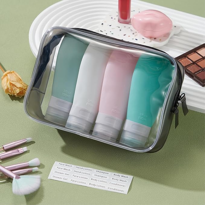 - TSA Carry on Approved: 4 pack 3 ounce silicone travel bottles, perfect for shampoo, conditioner, body wash, lotion, hand sanitizer, shower gel. Packed with a high quality zippered clear toiletry bag, saving space, easy to carry with for travels or gym workout.