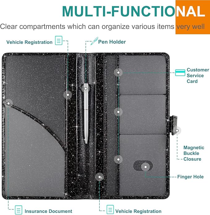 RSAquar Car Registration and Insurance Holder, Vehicle Glove Box Organizer Cool Car Accessories, Auto Truck Document Holder for Cards, Driver License, Black Glitter