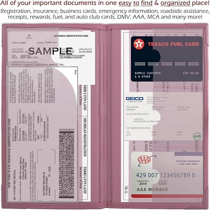 - 7 POCKETS - Enough space for all of your important vehicle-related documents including registration & insurance, business cards, emergency information, roadside assistance, rewards, fuel, and auto club cards, DMV, AAA, MCA.