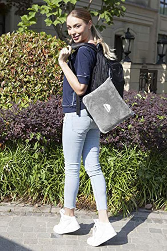 - Backpack clip included in the package: With the backpack clip / carabiner, you can clip this blanket pillow to any backpack or to any other luggage - with the soft light gray travel blanket.