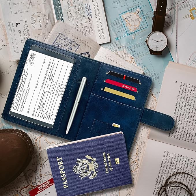 - RFID Blocking: Our passport holder with vaccine card slot is equipped with advanced RFID blocking technology, offering protection against RFID skimming. With our RFID passport holder, no more worry about leakage of your valuable personal information is stored in your passport and credit cards. Our pass-port and vaccine card holder will safely prevent your documents from folding, bending or crumpling.