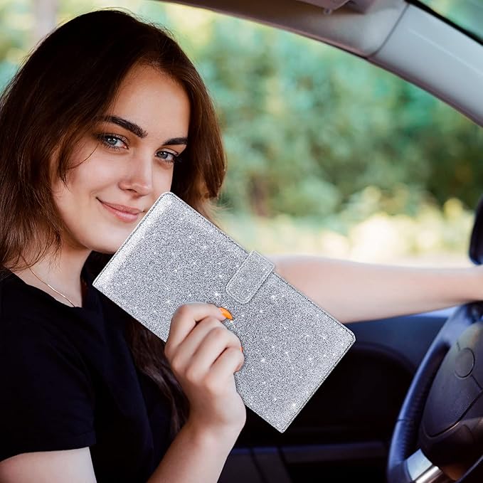 RSAquar Car Registration & Insurance Holder - Leather Glove Box Organizer, Cool Accessories for ID, Driver's License Cards & Essential Documents, Men & Women, Glitter Gray