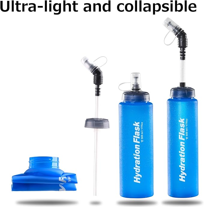 - Space-saving: The soft flask is compact and durable. When filled, the bottle stands upright and shrinks to reduce movement while drinking. Once the water is consumed, it can be folded into a compact size and stored in your pocket