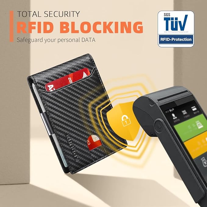 - ππ ππ ππ§ππ’-ππ‘πππ ππππππππ - this slim wallet for men equipped with German Instiute Certified RFID Security technology, a unique metal composite, engineered specifically to block 13.56 MHz or higher RFID signals to protect the valuable information and privacy