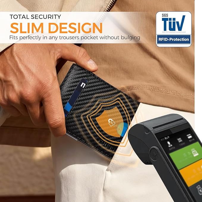 - ππ ππ ππ§ππ’-ππ‘πππ ππππππππ - this slim wallet for men equipped with German Instiute Certified RFID Security technology, a unique metal composite, engineered specifically to block 13.56 MHz or higher RFID signals to protect the valuable information and privacy