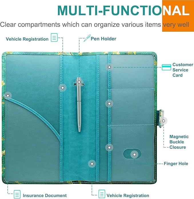 - WELL ORGANIZED: The car document holder has been custom made to perfectly keep all of your important documents together. It has multi-function clear compartments which can organize various items very well. Clear and easy to read both documents when you open it up. 1 large pocket for insurance documents and 2 pockets for vehicle registration, 3 small pockets for driver's license, ID cards, AAA cards, business cards, receipt, key contact information cards, etc.