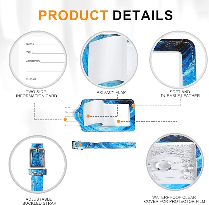 - DURABLE MATERIAL: Our cute luggage tag holders are made of high-quality leather, ensuring softness and durability. The sides are sewn with silk thread, able to withstand the wear and tear of extended use and travel. PACKAGE INCLUDES: You'll receive a 4 pack luggage tags suitable for both men and women. Each bag tag measures 4.92 x 2.76 inches and has an adjustable buckled strap for secure attachment. The card slot is perfect for standard business cards or debit cards.