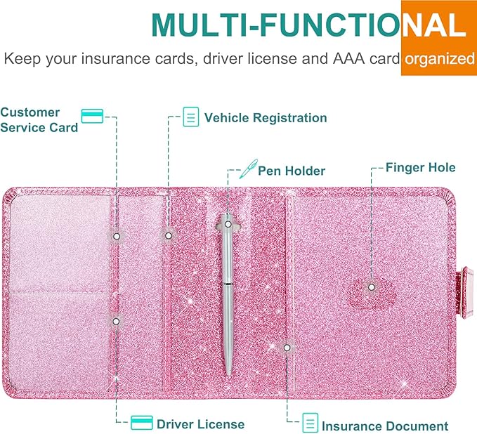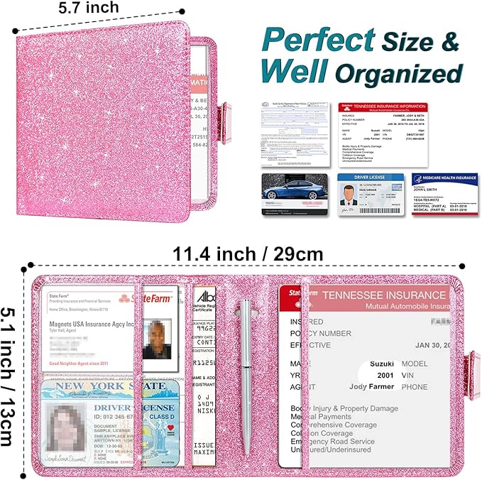- WELL ORGANIZED: The car document holder has been custom made to perfectly keep all of your important documents together. It has multi-function clear compartments which can organize various items very well. Clear and easy to read both documents when you open it up. 1 large pocket for insurance documents and 1 pockets for vehicle registration, 2 small pockets for driver's license, ID cards, AAA cards, business cards, receipt, key contact information cards, etc.