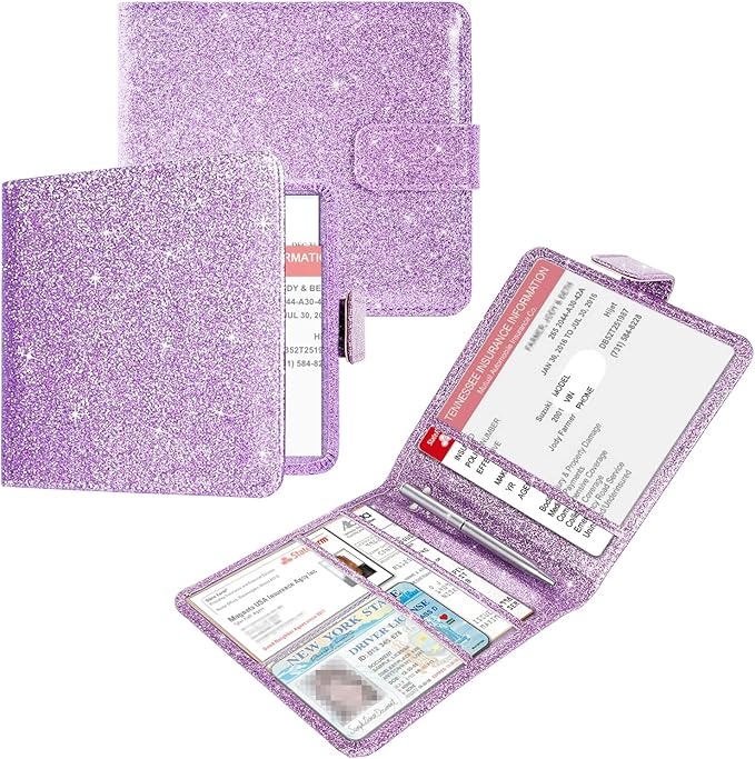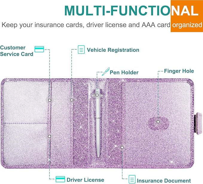 - WELL ORGANIZED: The car document holder has been custom made to perfectly keep all of your important documents together. It has multi-function clear compartments which can organize various items very well. Clear and easy to read both documents when you open it up. 1 large pocket for insurance documents and 1 pockets for vehicle registration, 2 small pockets for driver's license, ID cards, AAA cards, business cards, receipt, key contact information cards, etc.