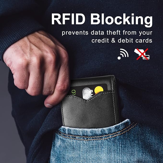 - Rfid Blocking: Our wallets are equipped with German Instiute Certified RFID Security technology, a unique metal composite, engineered specifically to block 13.56 MHz or higher RFID signals to protect the valuable information and privac.