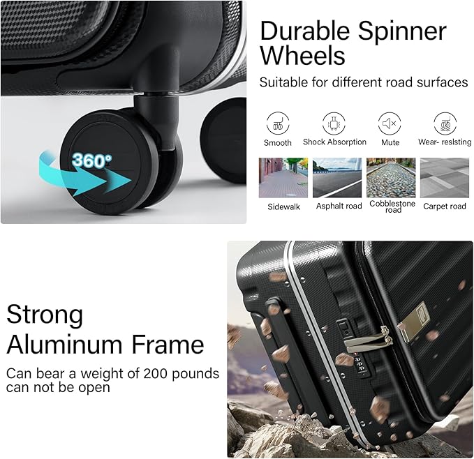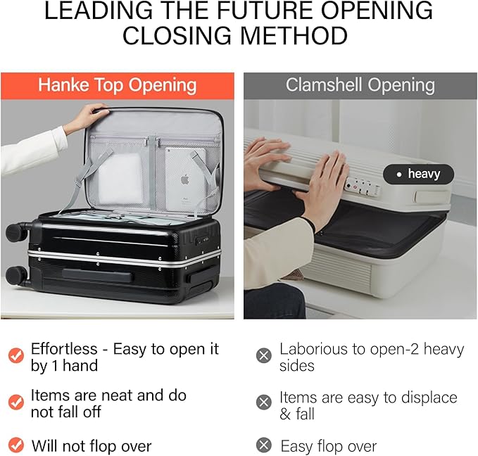 - 【CREATIVE FRONT OPENING】This trunk luggage with spinner wheels Leading the future opening and closing method which is effortless to open or close the suitcase, not only is it easy to load, but it also saves space. This design solves the problem that traditional luggage separated 2 compartments of heavy load then it's difficult to open and close. Importantly, it also avoid the displacement of items.