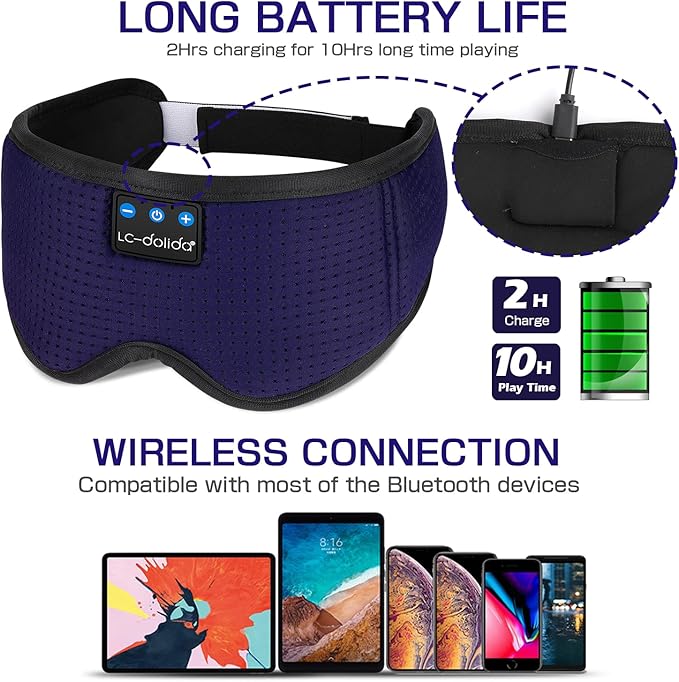 - 【Perfectly Block Out Light & Wireless Connection】LC-dolida Sleep headphones sleep mask with bluetooth headphones has a full coverage and unique nose area design, it can effectively block out light, prevent light leakage and makes your sleep better, Get the benefits of total blackout, whether at home, in a hotel or on the plane. The breathable, fibers of hypoallergenic material allows healthy oxygen in while keeping dry air out, which make you fall asleep faster