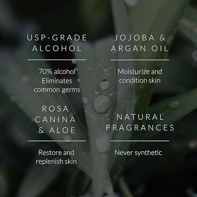 - MOISTURIZING, NON-STICKY SPRAY: 70% sugarcane-derived alcohol plus Jojoba, Argan, Rosehip, and Coconut oils. This hand sanitizer spray bottle is effective against common bacteria while keeping hands soft, not dry or sticky, and works perfectly as a travel size hand sanitizer.