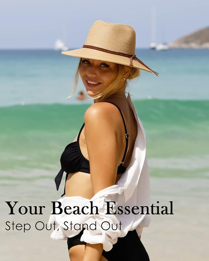 - Womens Beach Hat with Sun Protection UPF 50+ has a dense weaving, a high crown and 3.15 inches wide brim,covering your face and protecting you from harmful rays;This Sun Fedora Hat will enhance of any type of clothing you wear from sports shorts,jeans,weddings,to business suits