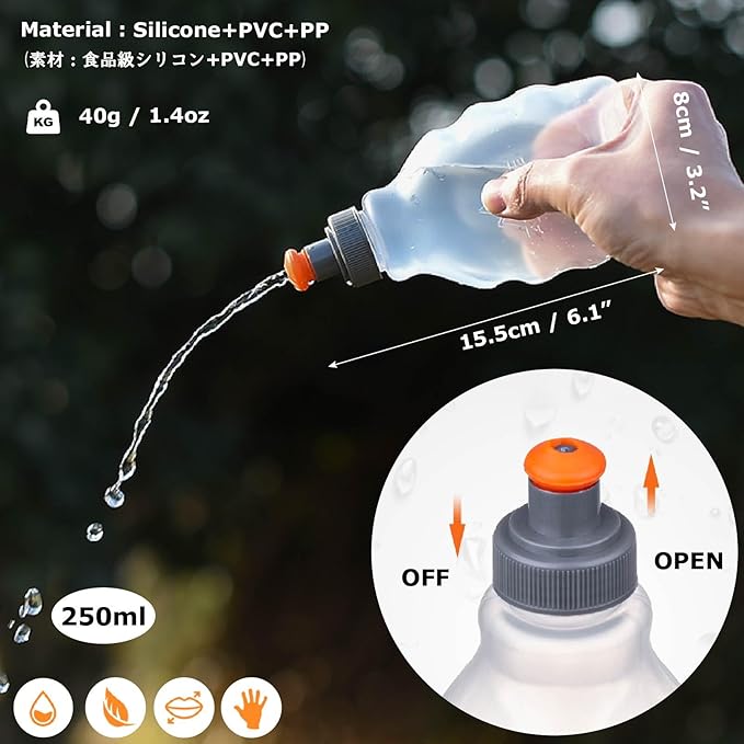 - Material and design: The hydration vest is made of nylon, polyester mesh