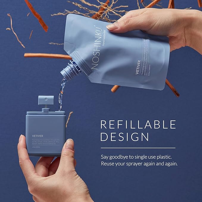Noshinku - Refillable Hand Sanitizer Vetiver 3-Pack, Travel Size Spray with Hydrating Botanical Oils, Natural Ingredients, All Natural Fragrances, Sugarcane Derived Alcohol, No Parabens, No Dyes