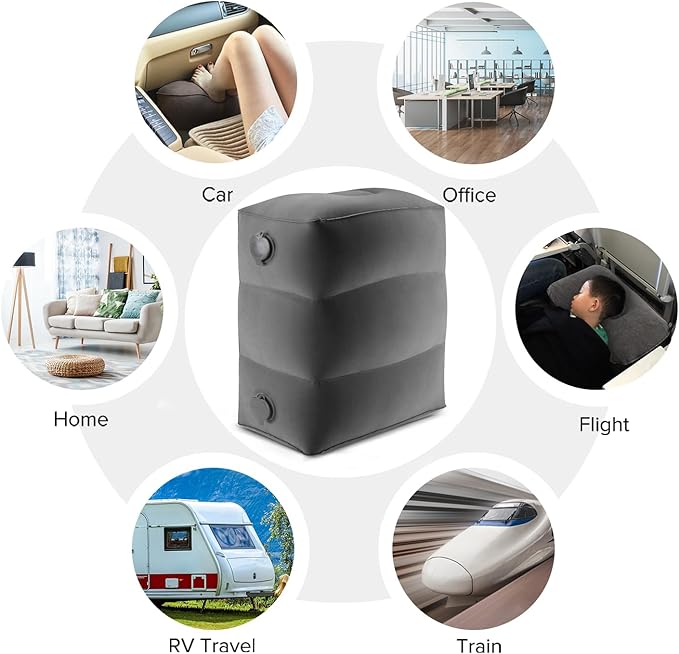 - Note: We advise you to check with your airline in advance, because some airlines do not allow you to use this product; Practical Design: Inflatable foot rest designed with two double cap valves and adjustable height; The double cap valve design makes your inflation very quickly and you don't need the extra pump; This inflatable footrest was divided into chambers so that you could adjust the size you need