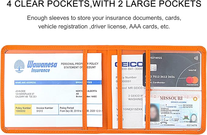 - CAR ORGANIZER PRACTICALITY: Car registration and insurance holder has multi-function clear compartments which can organize various items very well. The car document holder large pocket for insurance documents and pockets for vehicle registration, small pockets for driver's license, ID cards, AAA cards, business cards, receipt, key contact information cards, etc. It can fully meet your needs