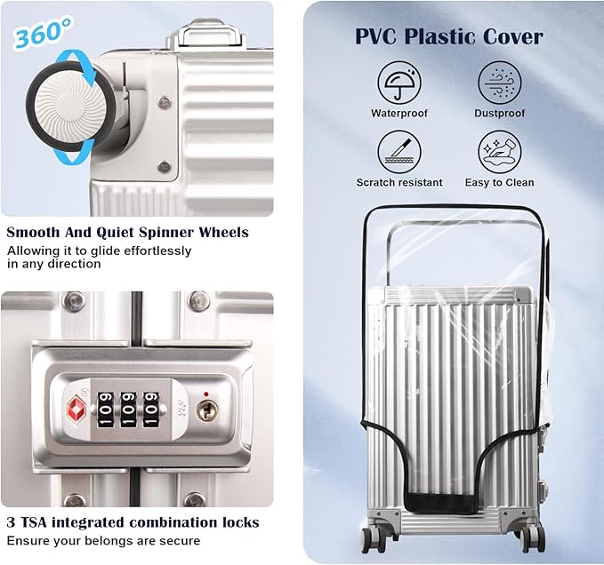 - 【Shiny And Sturdy Suitcase】: This Dominox luggage features a sleek and modern look with its aluminum hard side shell in a stylish silver color. The aluminum construction not only adds to the aesthetic appeal but also provides excellent durability and protection for your belongings. Vertical grain look makes it very high-end.