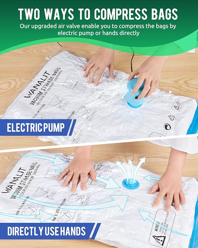 - 【Upgraded 2 Ways to Compress】Our vacuum storage bags are upgraded on the air valve which is not only cap-free design, also allows you draw the air out of the bags with 2 ways.Firstly you can use the included electric pump to take the air air out of the bags, which is powerful and very fast. Secondly, you can directly use your hands to press the bags to make the air out of the bags