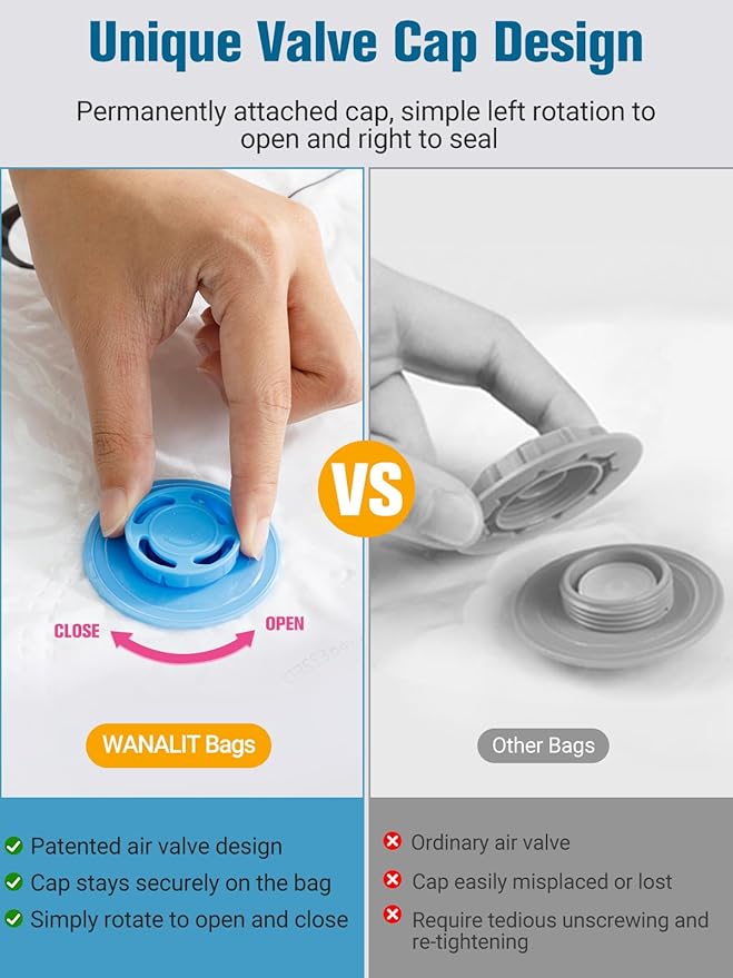 - 【Unique Valve Cap Design】Our innovative valve cap design sets us apart from other vacuum bags. Unlike standard valve caps that require tedious unscrewing before pumping and re-tightening afterward - not to mention being easily misplaced. our revolutionary design features a permanently attached cap that stays securely on the bag. With simple left rotation to open for pumping and right rotation to seal after use, this hassle-free mechanism eliminates the need for removal while ensuring you'll never lose the cap