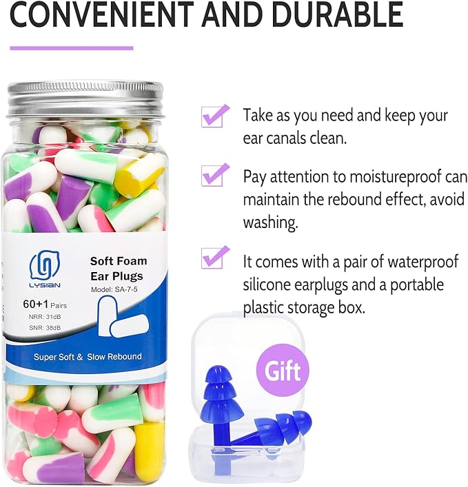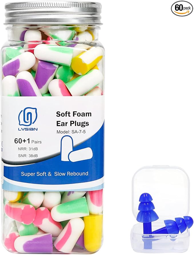 LYSIAN Ultra Soft Foam Earplugs for Sleep- Noise Cancelling Ear Plugs for Sleeping, Shooting,Snoring, Mowing Sound Reduction 38dB- 60 Pairs Multi Color