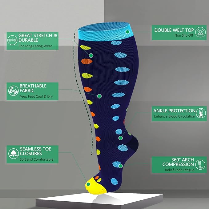- 【COMPRESSION THERAPY PROMOTES HEALTH】- Our Plus Size compression socks with graduated pressure effectively promote smooth flow of blood vessels from the distal end to the proximal end. More improve blood circulation and oxygen flow means more healthier legs and less pain and swelling. Our Graduated Compression Stockings support your legs, reduce fatigue, soreness, and prevent injuries, cramping, swelling and help in muscle recovery and varicose veins.