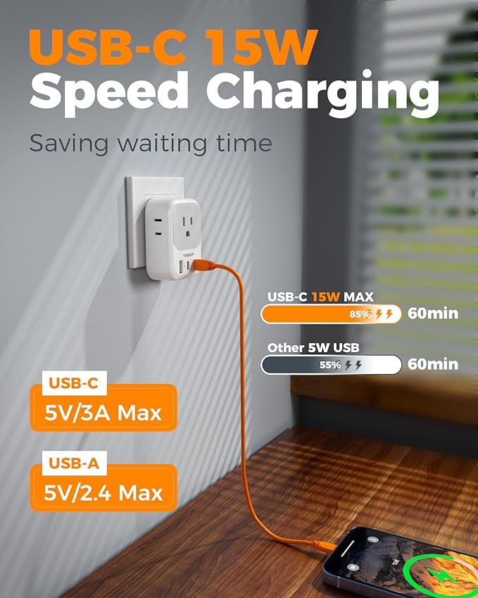 - USB C 15W Speed Charging: Dual USB C ports can charge up to 3A max, the USB A port provide charging speed up to 2.4A max; 2 types of USB ports can detect charged devices and give you more charging options; ideal for charging your cell phone, tablet, laptops, camera, earphone, etc