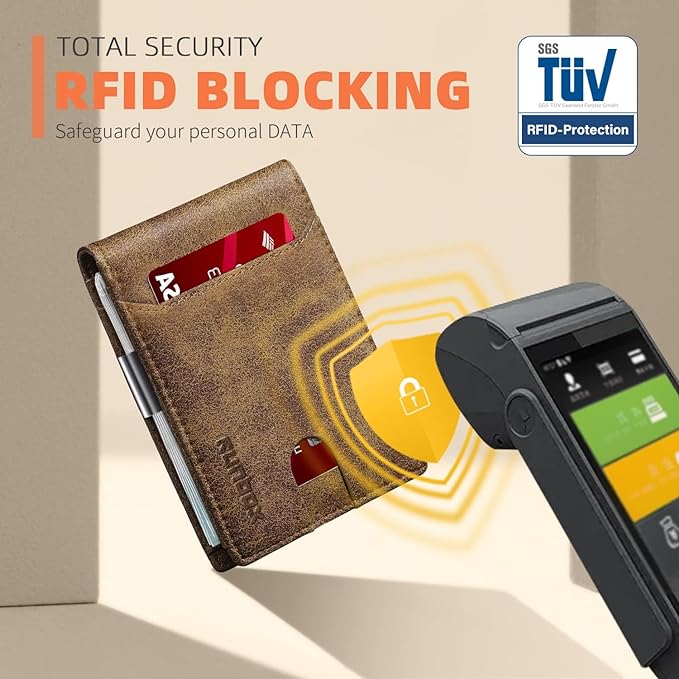 - ππ ππ ππ§ππ’-ππ‘πππ ππππππππ - this slim wallet for men equipped with German Instiute Certified RFID Security technology, a unique metal composite, engineered specifically to block 13.56 MHz or higher RFID signals to protect the valuable information and privacy