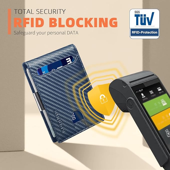 - ππ ππ ππ§ππ’-ππ‘πππ ππππππππ - this slim wallet for men equipped with German Instiute Certified RFID Security technology, a unique metal composite, engineered specifically to block 13.56 MHz or higher RFID signals to protect the valuable information and privacy