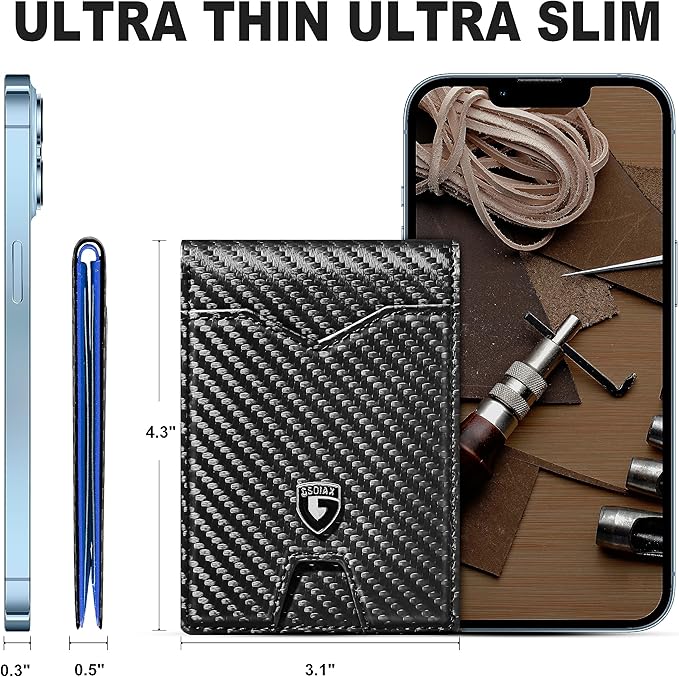 GSOIAX Mens Slim Wallet for Men Minimalist Genuine Leather Carbon Fiber Rfid Blocking Bifold Credit Card Holder With Gift Box (Blue and Carbon Black)